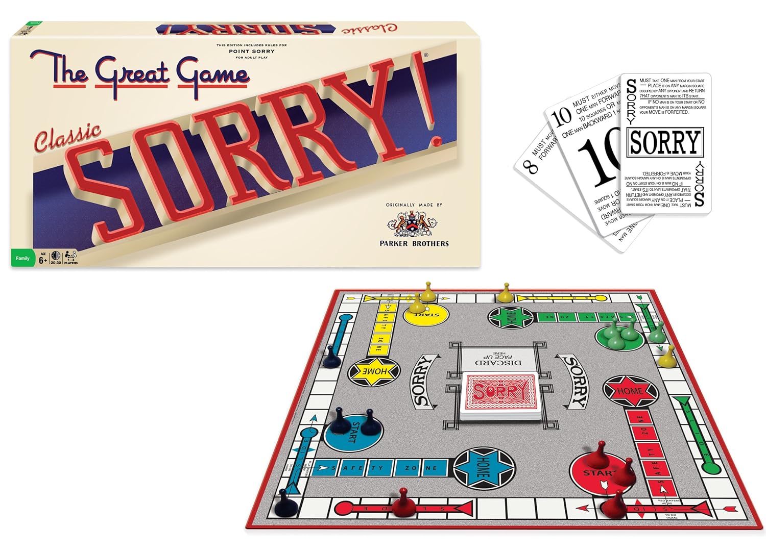 - Contents: Heavy-duty bi-fold gameboard with original artwork, 16 iconic Sorry pawns, Deck