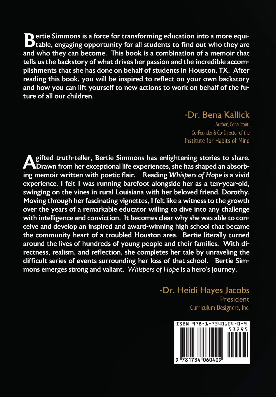 For 61 years Dr. Bertie Simmons, Ed.D. author of Whispers of Hope: The Story of My Life, was a dedicated educator in the Houston Independent School District (HISD). Simmons came out of retirement to serve as principal of Furr High School in 1999. During her more than 17 year tenure, she was instrumental in revitalizing the school and creating transformational opportunities for some of Houston’s most disadvantaged students. Known as a visionary and a change agent who can bring out the best in her students, the high-energy educator maintained that upbeat and infectious attitude to reach and inspire her teachers and students with her passion, knowledge, dedication, and maybe even the occasional rap song or two.The first of Simmons’ seemingly countless honors came in 1965, when she was named the HISD Teacher of the Year. That distinction was followed by many more, including HEB’s Best High School Principal in Texas award in 2011 and KHOU’s Schools Now Spirit of Texas award. In addition, Furr was one of only three schools in the nation identified for the College Board Inspiration Award in 2011 As evidence of Simmons’ indelible impact on Furr High School, education advocate and philanthropist Laurene Powell Jobs, wife of the late Apple, Inc. CEO Steve Jobs, recognized Furr High School as a recipient of a $10 million grant through the XQ Super School Project. Simmons’ school was one of 10 selected from nearly 700 schools nationwide for “reimagining high school education.”