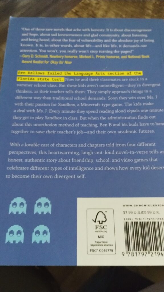 As the five get to know each other, friendships form and the characters work together to solve their problems. In this book you will find free verse, stream of consciousness, chat, and graphics which Charlie loved. I love how ms. J implements 10 minutes of the day to reading aloud during class which equals 10 minutes of Ms. J playing Sandbox (a building game)