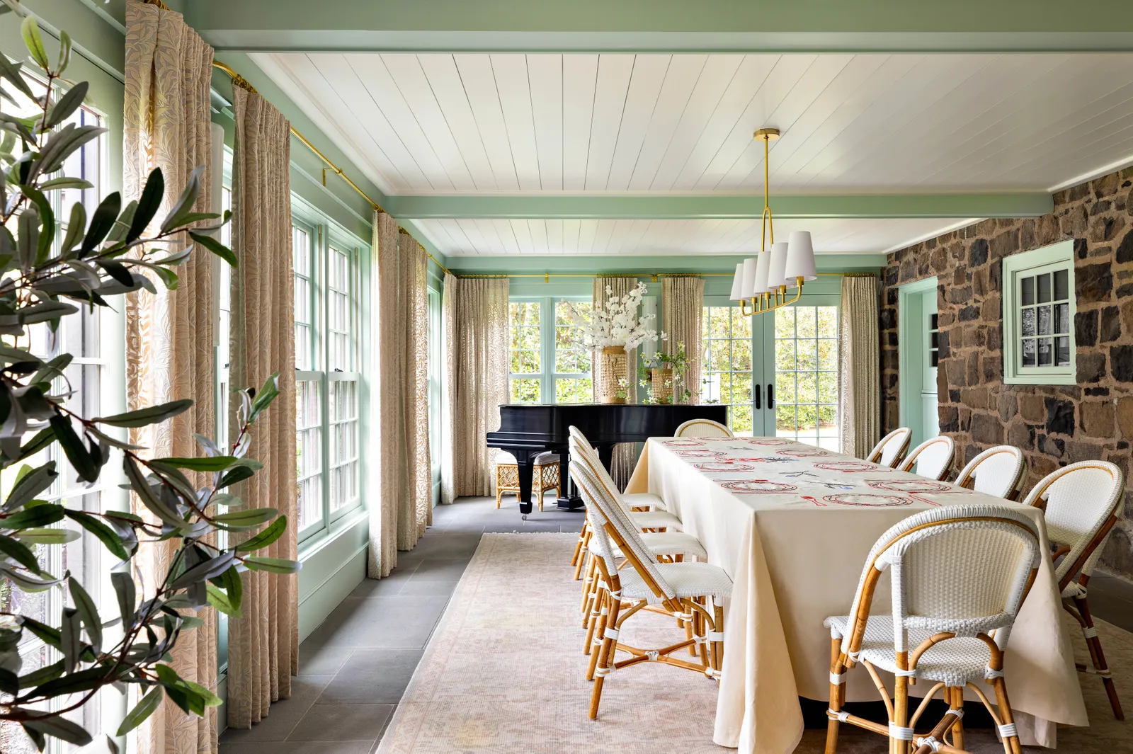 The kitchen and dining room are adorned with glassware that were passed down to Howard by her Grandmother Jean and the dining room features a large table that has been in the family for many years. The tablecloth that covers is was custom made featuring tulips, which is a nod to Amsterdam, which is where Bryce and her husband Seth Gabel first fell in love. The dining room also features a piano that Howard took lessons on as a child.