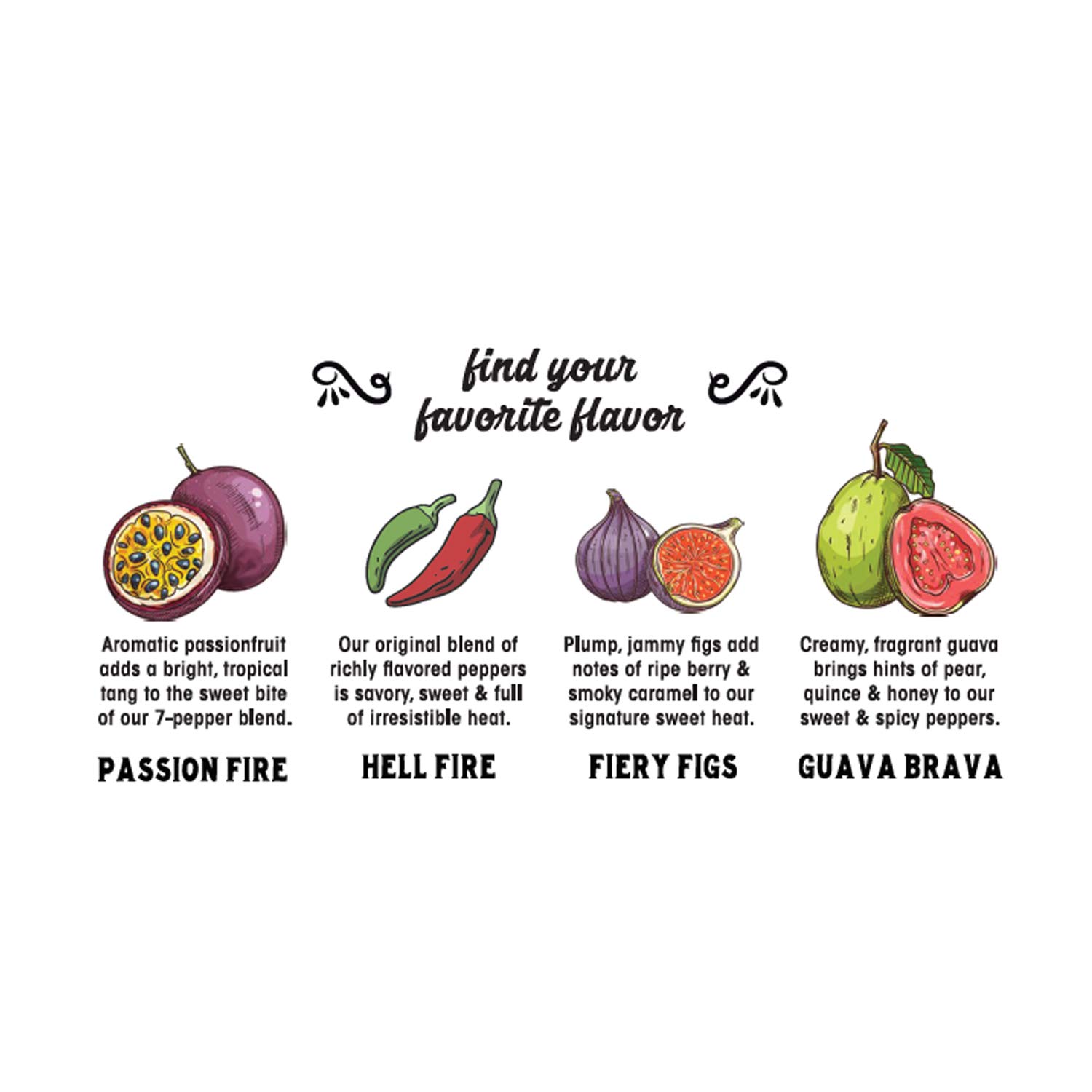 - Includes one each of our Hell Fire, Fiery Figs, Passion Fire, and Guava Brava flavors