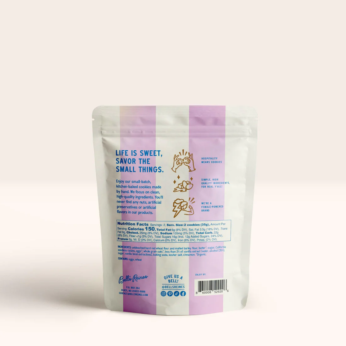 The Cookies are made by hand and they use clean high-quality ingredients. There is no, nuts as I said earlier or artificial preservatives or artificial flavors in the Cookies. Bell’s Reines are a female- powered brand.