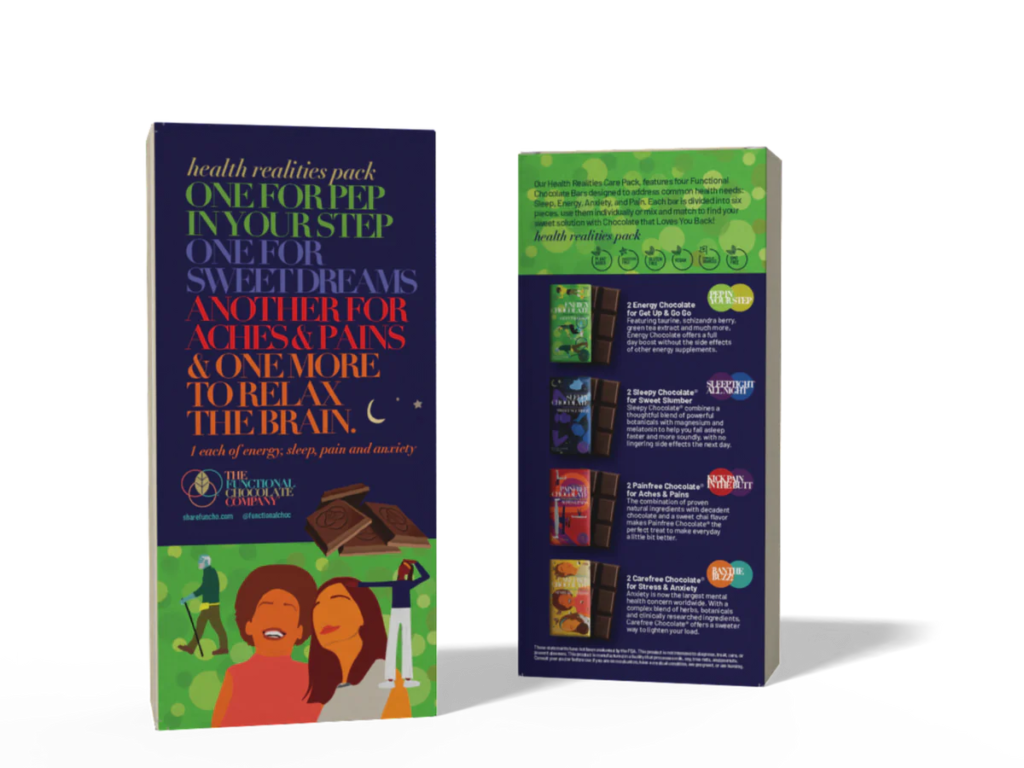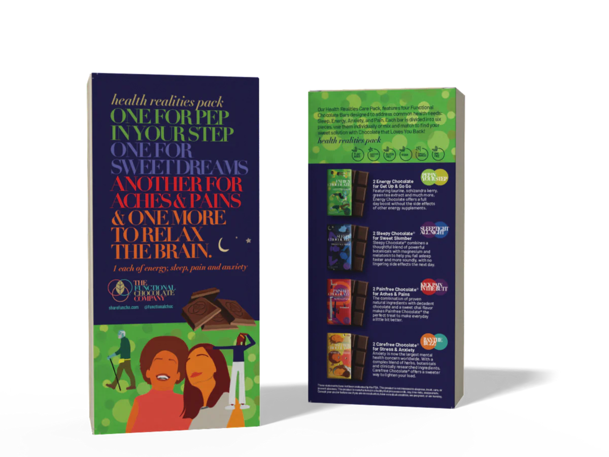 Looking for a thoughtful, health-conscious gift that’s as delicious as it is purposeful? The Health Realities Care Pack offers a complete toolkit for navigating life’s everyday challenges. This curated set includes four functional chocolate bars—Sleepy, Energy, Carefree, and Painfree—each designed to address specific wellness needs, from promoting restful sleep to boosting energy and easing stress or discomfort.