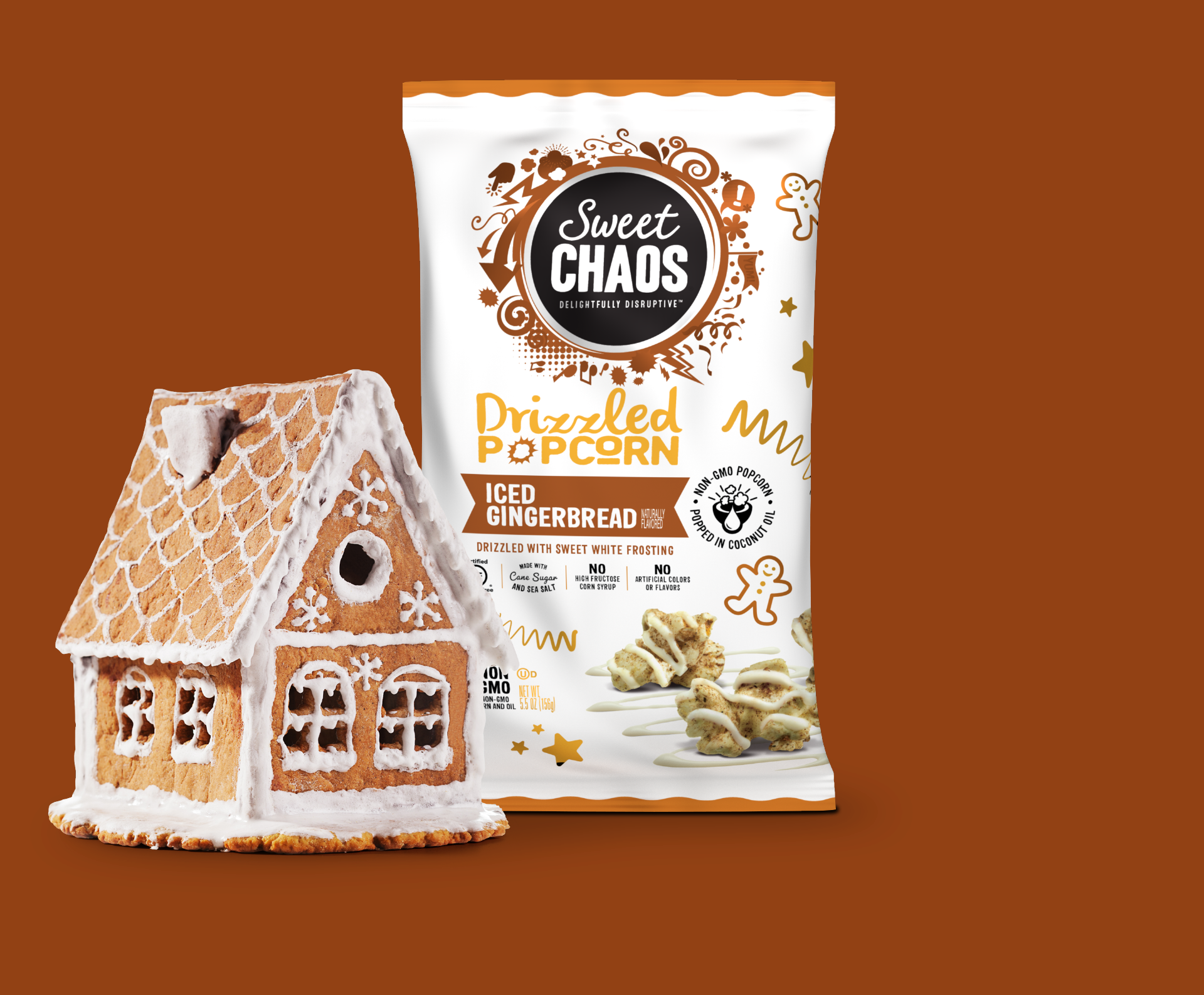 The last couple days I’ve been sharing Sweet Chaos Drizzled Popcorn with you. I’m not finished yet. Let me introduce you to our latest addition Sweet Chaos Iced Gingerbread DRIZZLED WITH SWEET WHITE & DARK FROSTING and for other flavors check out “Sweet Chaos”.