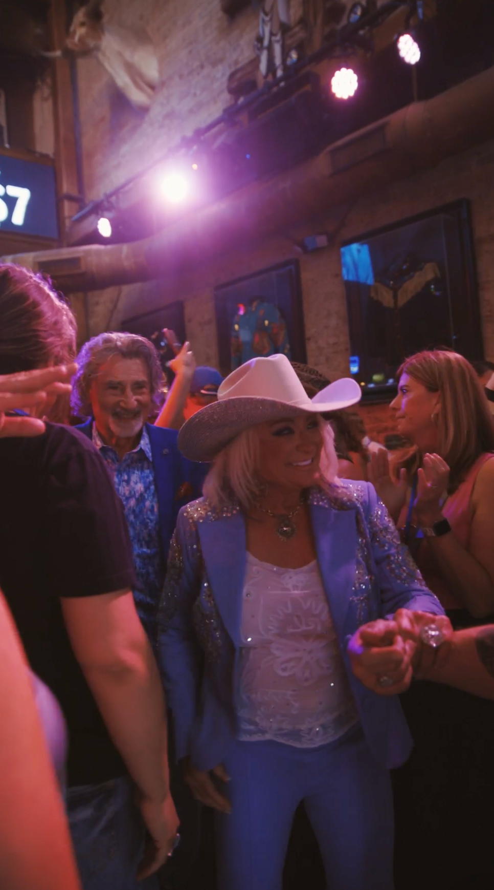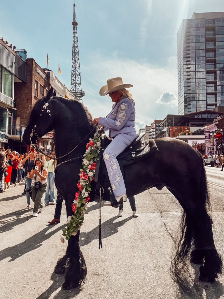 NASHVILLE, Tenn. (May 3, 2024) – Last night, Country Music Hall of Fame member and GRAMMY Award-winning artist Tanya Tucker got into “Some Kind of Trouble” at the grand opening of Tanya Tucker’s Tequila Cantina at Nudie’s Honky Tonk on lower Broadway. In true Tanya style, the legendary artist, dressed in a custom Double D Ranch periwinkle suit embellished with rhinestones, galloped down the infamous Broadway Street on the back of a beautiful black Friesian stallion named Lauw that was adorned with fresh flowers. Thousands watched reverently on either side of Broadway to witness the historic ride of Tanya Tucker from Fifth Avenue to the front door of Nudie’s Honky Tonk.