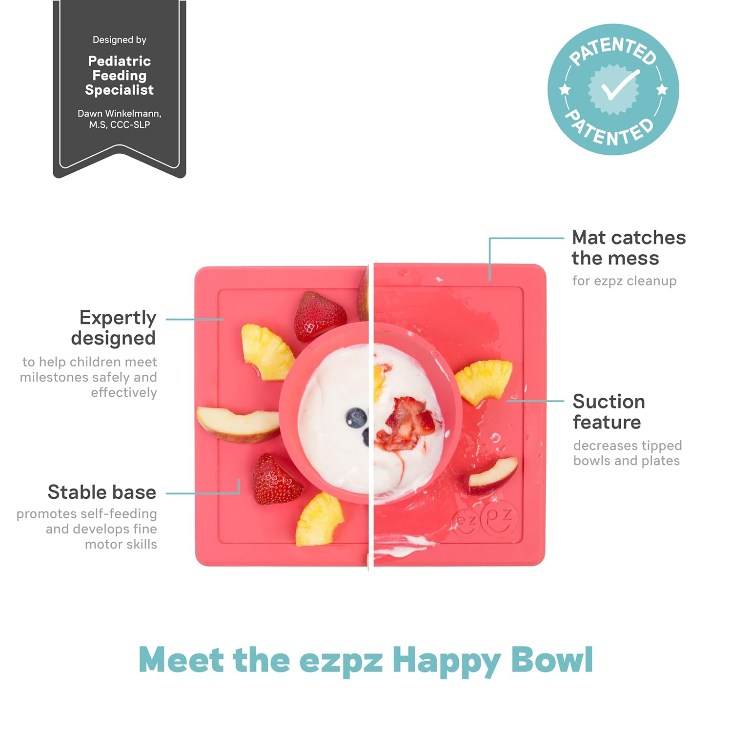DESIGNED + TESTED BY A PEDIATRIC FEEDING EXPERT: All ezpz products are designed to help children meet milestones safely and effectively. The stable base of the Happy Bowl helps children eat soup, pasta, oatmeal and cereal.