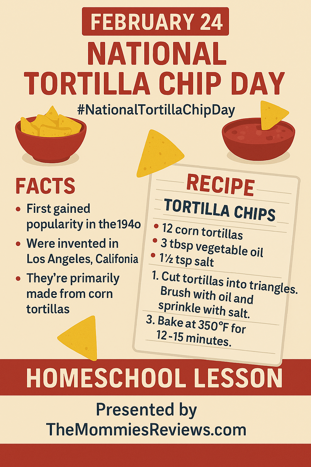 February 24 National Tortilla Chip Day #NationalTortillaChipDay which would be a naci snack this morning. I’ve created a Lesson Plan you can use if your #Homeschooling your children and shared facts about Tortilla’s with you. Along with a kid-friendly recipe for Homemade Baked Tortilla Chips families can make during class or for dinner this evening.