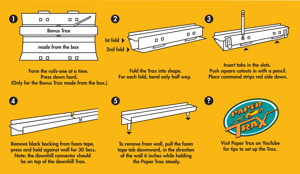 The genius of Paper Trax is how they are made and how they are used. This is a completely recyclable, all paper-based race track created to race cars on Track attached to your walls! A new addition to the Paper Trax family is the Corner Track! Now you can Trax your whole house, from one side of your room to the other!