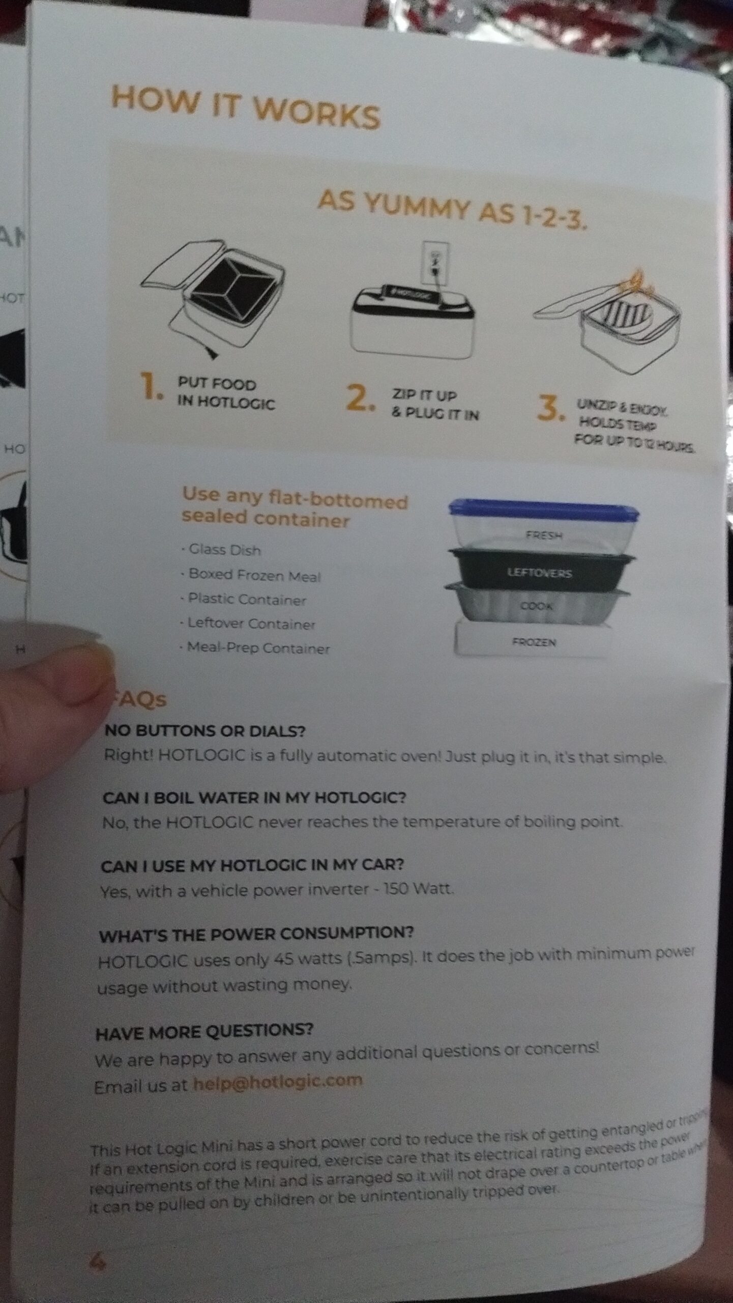 • 1. INSERT YOUR MEAL inside the HOTLOGIC® on top of the included heating element, and then zip it closed.