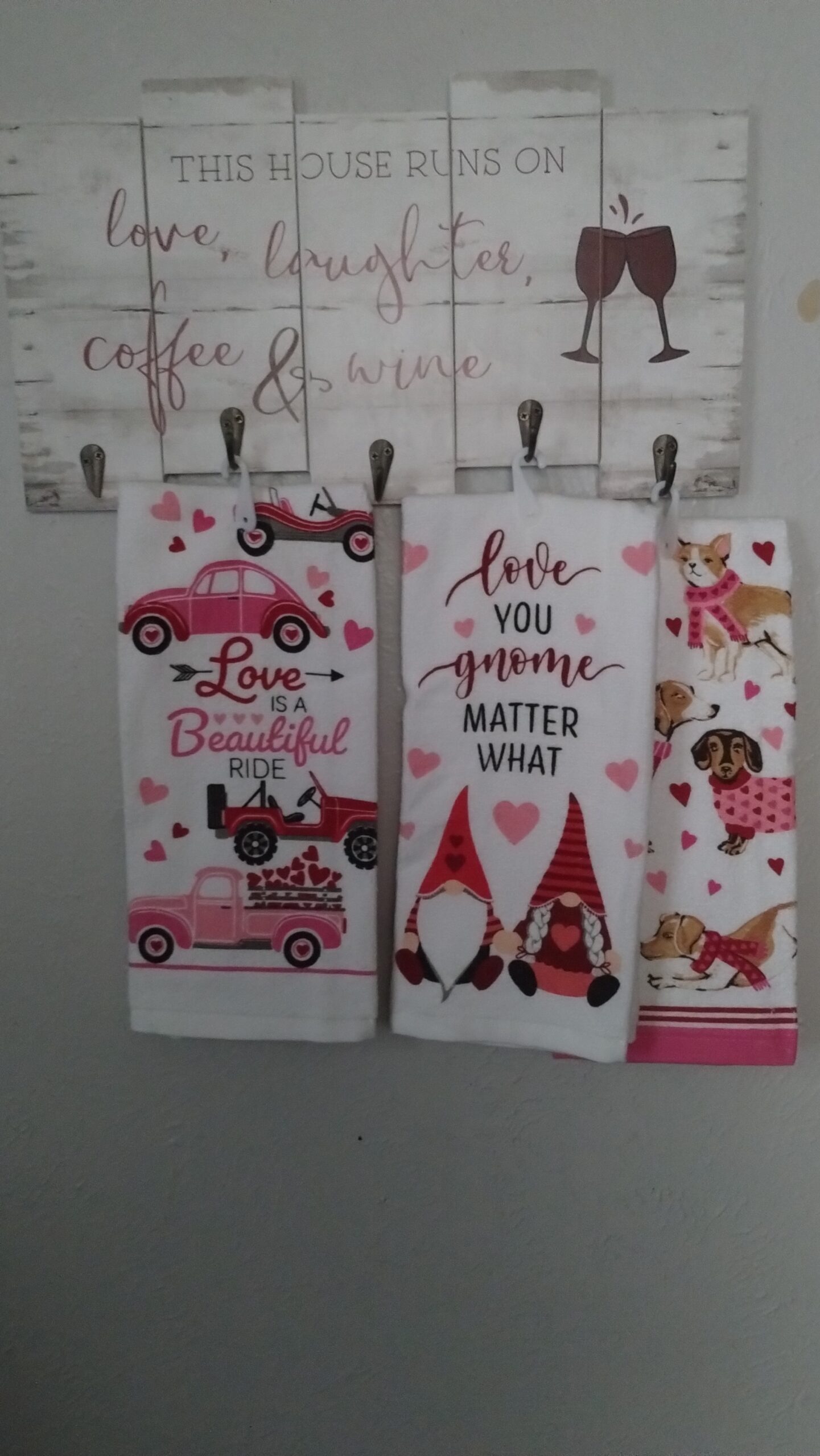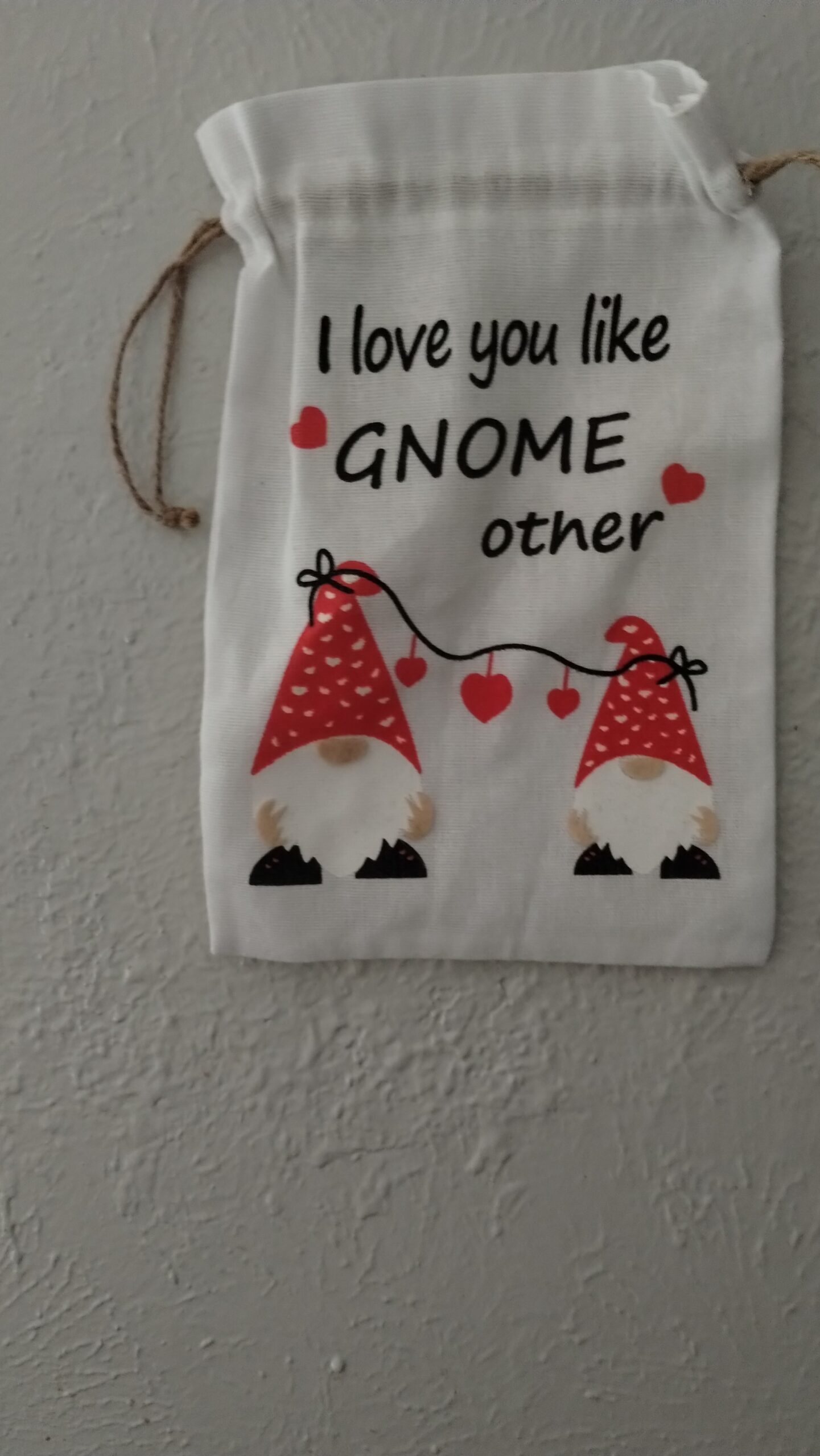 In the hallway leading to the dinning room and kitchen are cloth bags hanging on the wall. For Valentines I will be filling the bags with little treats for David and Charlie including Gift Cards for there favorite foods for lunch. You might remember last year the bags were hanging in our kitchen because we use decorations over and over again.