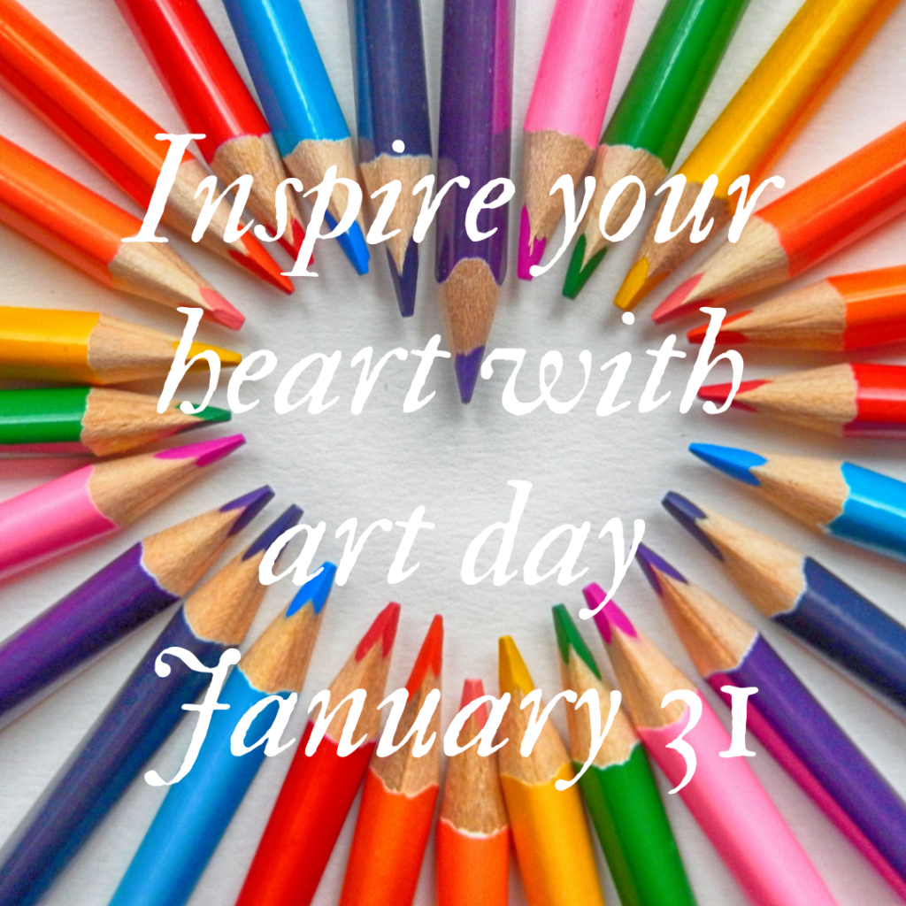 If David was home this morning we could create Art with food then we could visit a Art Museum for a Field Trip since David isn’t home we may go on a walk and look for Art in nature would you like to join us? No, matter what type of art you do today come back and share it with Charlie and I. Then share it on Social Media using this hashtag #InspireYourHeartWithArtDay