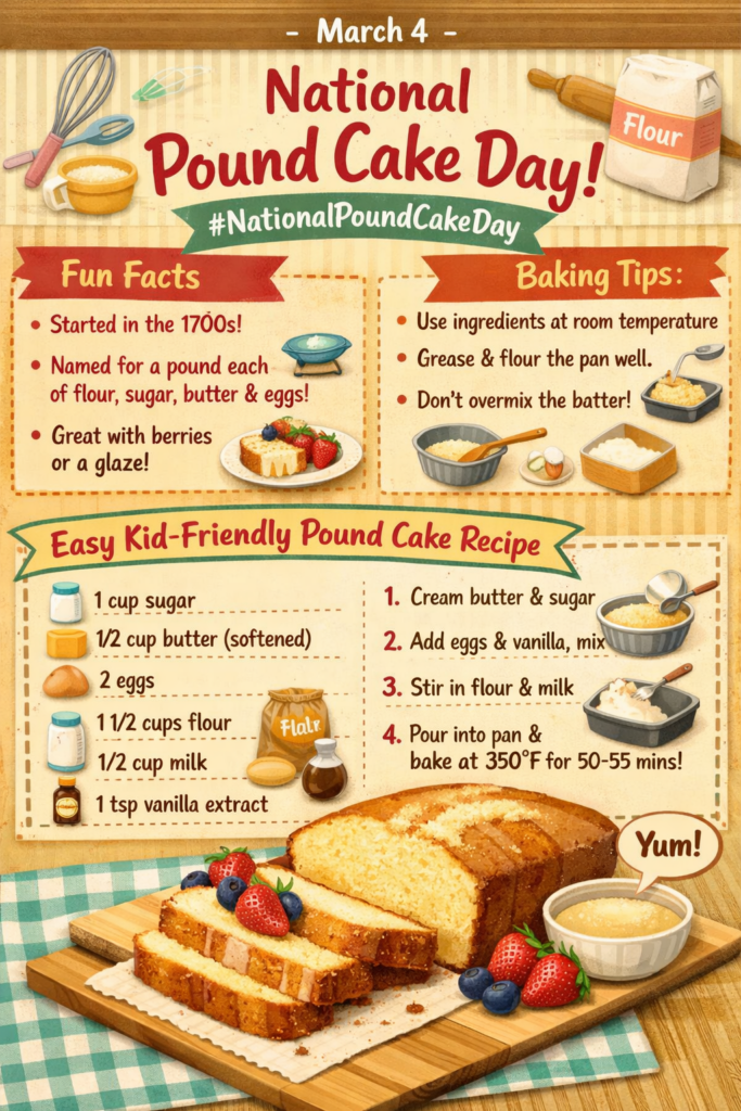 March 4th is National Pound Cake Day, a sweet celebration of one of the most classic desserts ever baked. Pound Cake has been loved for centuries thanks to its simple ingredients and rich, buttery flavor. It’s the perfect recipe to make with kids—easy steps, fun measuring moments, and delicious results.