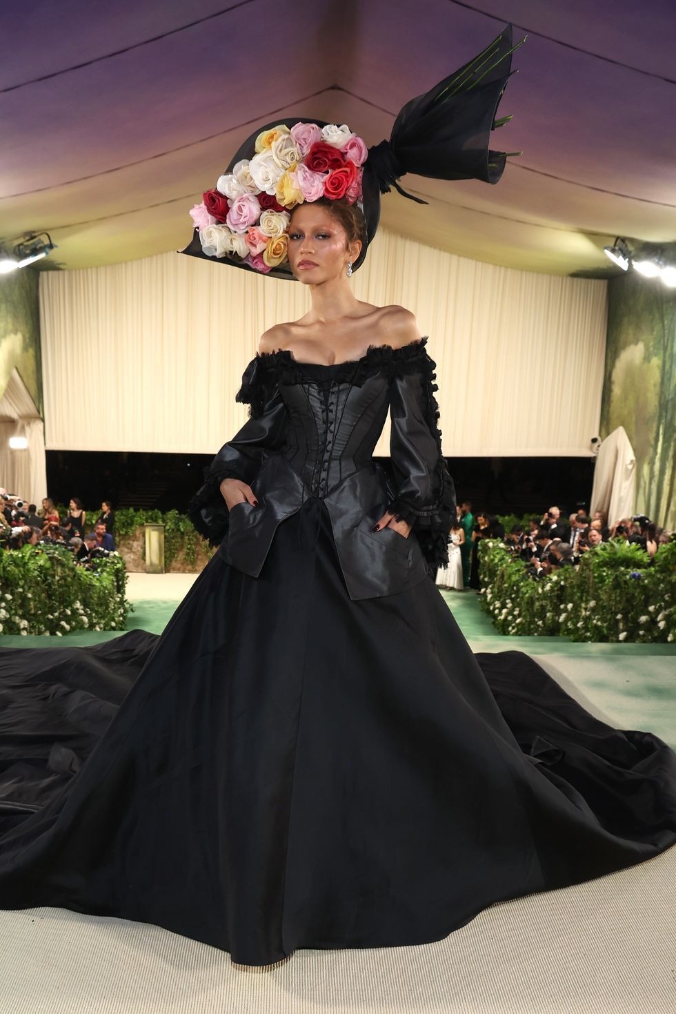 Zendaya stunned in a 1996 black gown from John Galliano’s Givenchy era and adorned it with a full bouquet of flowers on her head. She wasn’t the only star channeling dark florals, but she stole the show with the dramatic look.