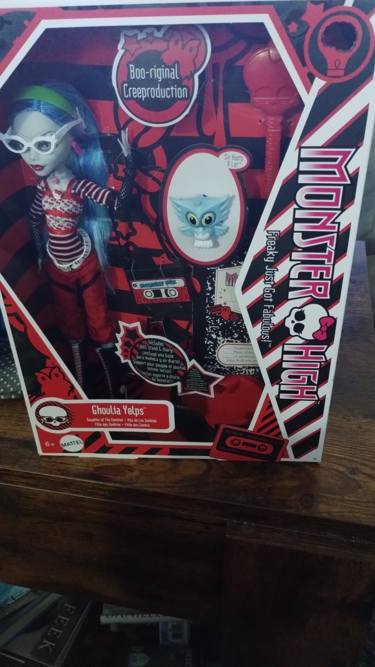 Let me tell you it’s been hard not opening the box and checking out the Diary Monster High Ghoulia Yelps Collectible Doll comes with and the Mix Tape. More than that I wanted the little Owl Sir Hoots a lot that is blue because my mom collected Owls. Charlie wanted the rattle with the skeleton on it. If Payton isn’t careful she may find Charlie and I opened the doll and use her doll stand to sit her up on our entertainment cabinet.
