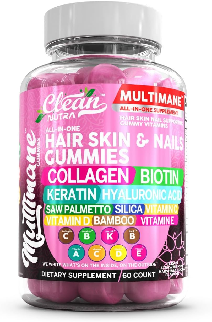Multimane hair skin and nails gummies by Clean Nutra, an advanced blend meticulously formulated to rejuvenate your beauty from within. Combines potent ingredients including biotin collagen, hyaluronic acid capsules, saw palmetto gummies, bamboo shoots, B6 vitamins, B12 vitamins 5000 mcg, vitamin D3 2000iu, vitamin C 500mg, folate 400mcg, silica complex, and vitamin A 10000 iu softgels. Our formula features mineral oil with collagen pills, vitamin B, vitamin B12 1000 mcg, vitamin D3 2000iu and vitamin B6 25 mg to support with overall health. Hair vitamins for women with hyaluronic acid gummies and folic acid 1000 mcg are a key component, revered for its ability to aid with retaining moisture, providing hydration and plumpness to the skin.