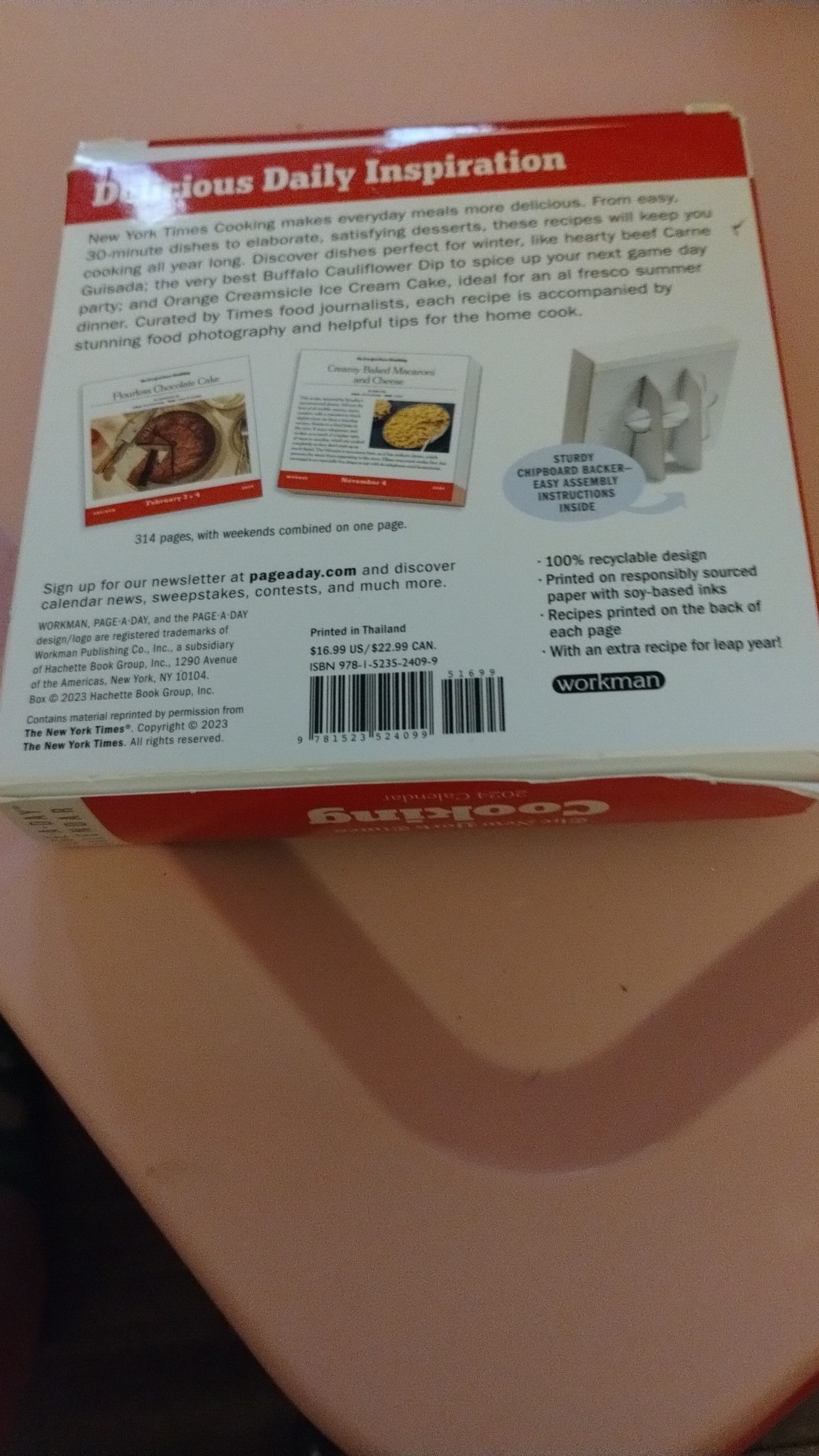 The New York Times Cooking Page-A-Day Calendar 2024: Fresh, Delicious Recipes For Every Day of the Year comes in a beautiful red box with a appetizing recipe on the cover that makes anyone looking hungry I love how the calendar can lay down or sit up using the stand on the back allowing people walking by to see the illustrations for the recipes they’ve included.