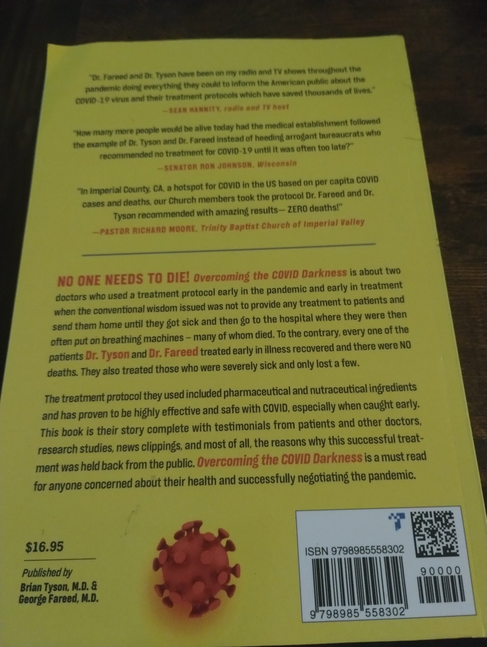 No one needs to die! Overcoming the COVID Darkness is about two doctors who used a treatment protocol early in the pandemic and early in treatment when the conventional wisdom issued was not to provide any treatment to patients and send them home until they got sick and then go to the hospital where they were then often put on breathing machines – many of whom died. To the contrary, every one of the patients Dr. Tyson and Dr. Fareed treated early in the illness recovered and there were NO deaths. They also treated those who were severely sick and only lost a few.
