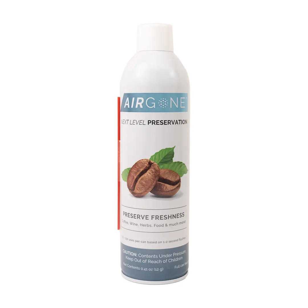 Introducing Airgone™, a pressurized Argon gas can. Argon is a non-reactive, odorless, tasteless gas heavier than oxygen. With just a 2-second flush of Airgone™ (good for 75 flushes), you can prevent freshness degradation by creating a barrier between your stored goods and excess oxygen. Displaced Oxygen releases through the degassing valve of the Fresh-Port™ products, in addition to naturally releasing C02 buildup.