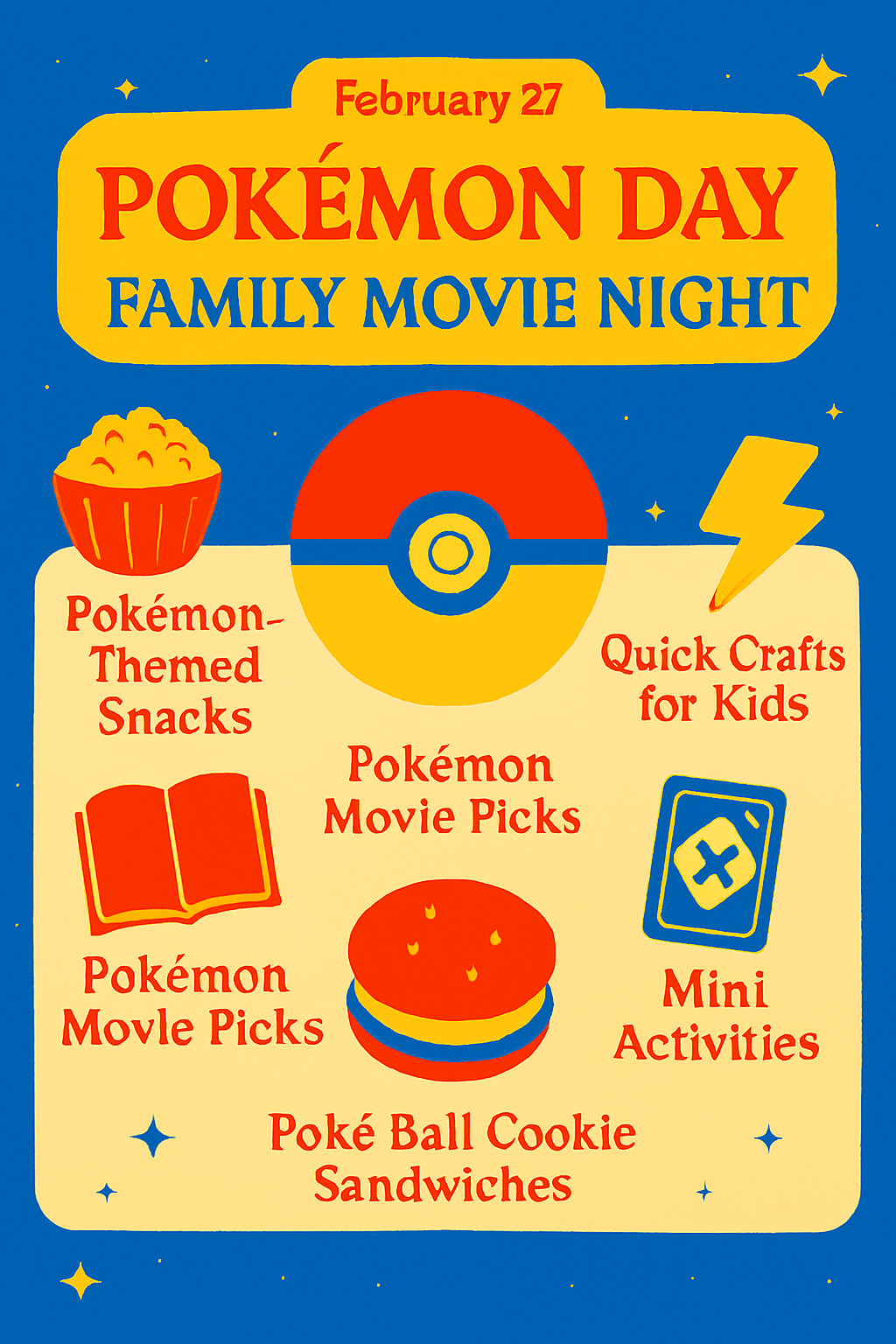 These snacks use the red/yellow/blue palette and avoid copyrighted character likenesses while still feeling unmistakably Pokémon‑inspired.