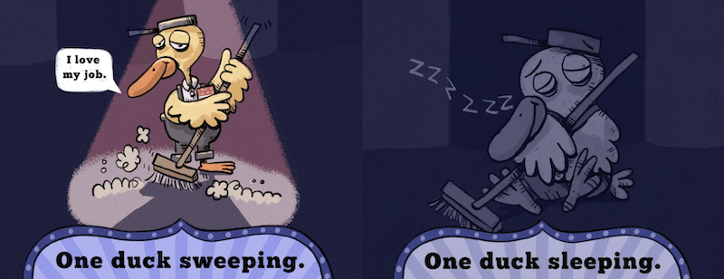 Theater janitor, Chuck Dükman, is ready to fall asleep but not until he finishes his sweeping duties. He accidentally takes a snooze and is roused by a cowcophony of clowns!