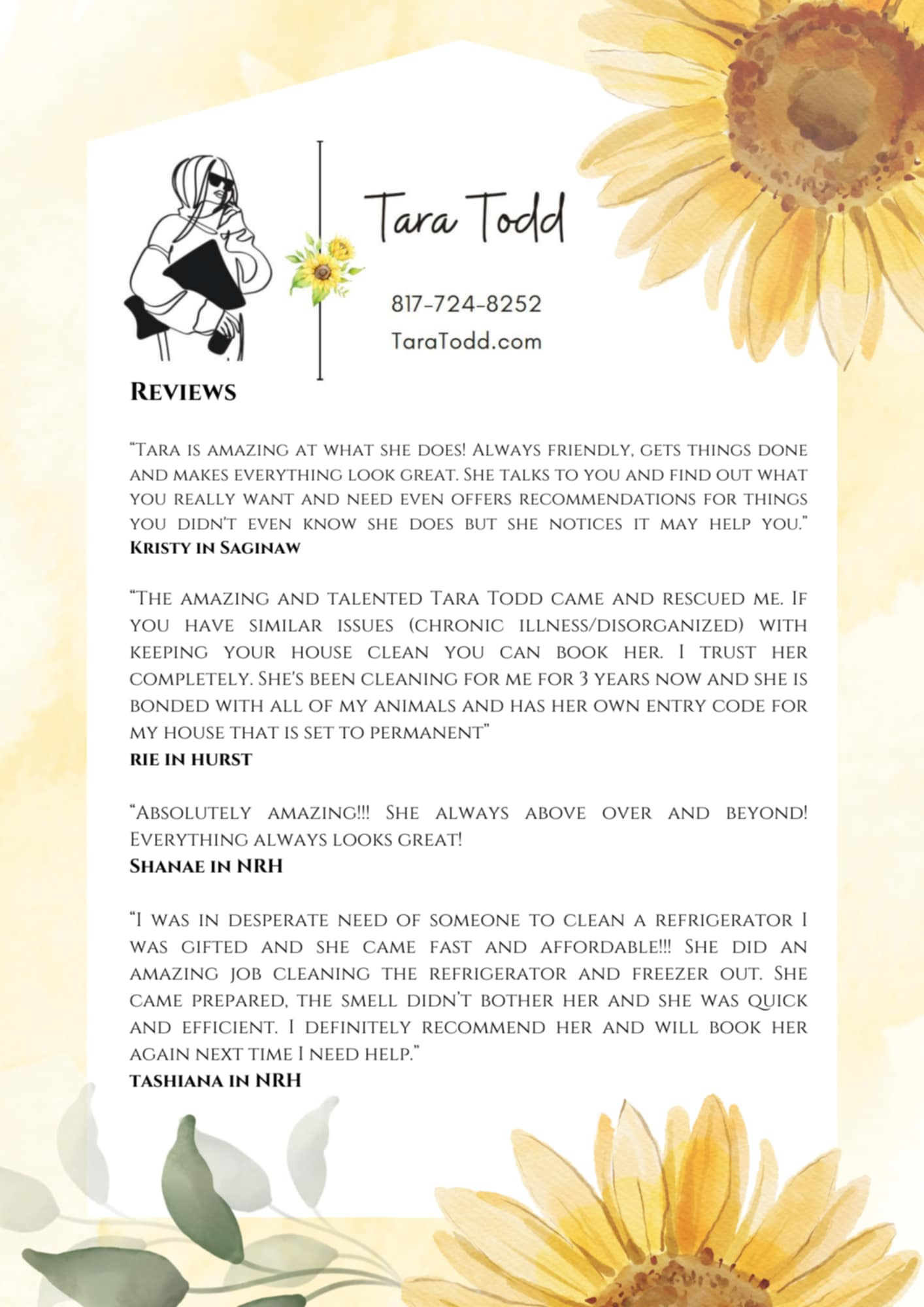 Deposit is due 3 days prior. $50 on regular cleans. $100 on move-out and post-construction cleans. I accept cash, Zelle and PayPal to Tara Todd 817-724-8252 TaraTodd86@gmail.com