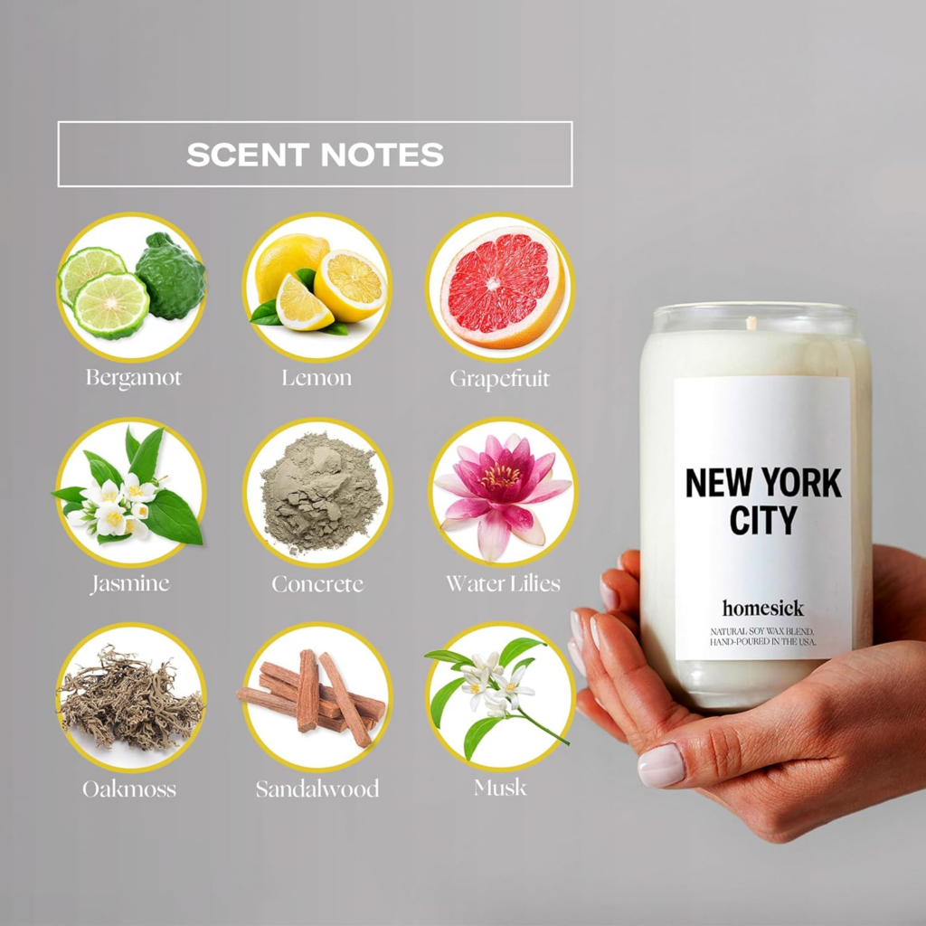 Urban Vibrance: The distinctive scents of Spring days in Central Park, fine department stores, and concrete capture the energy of the greatest City on Earth. The New York City Candle from Homesick brings the dynamic essence of NYC to your home. 13.75 oz.